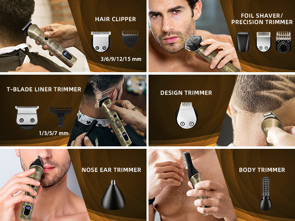 - Multifunctional design with 7 trimmer heads and 10 combs for precise haircuts, beard shaping, nose/ear trimming, and body grooming.