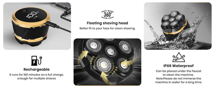 Electric shaver with 6D floating head, designed to contour to all head and face curves for a smooth and comfortable shave.