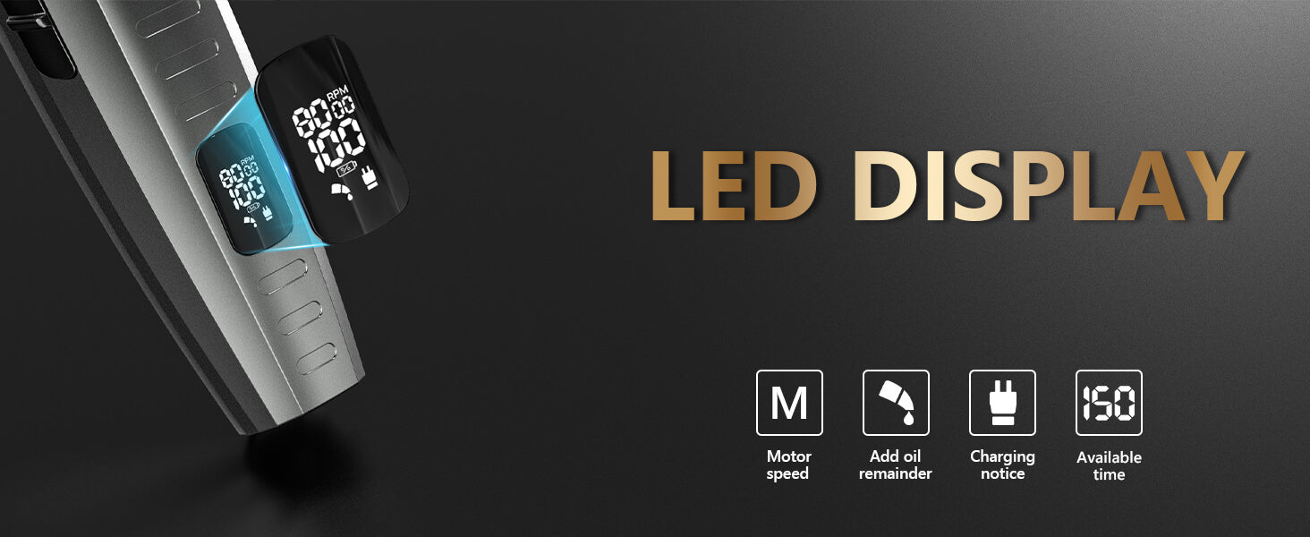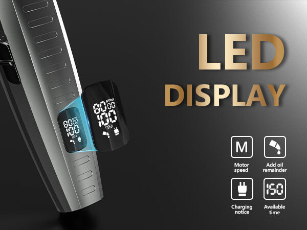 - Ergonomic grip with LED display showing battery and oil reminders.