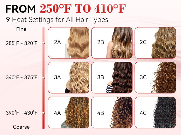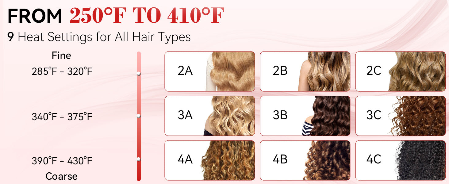 - 9 precision heat settings from 285°F to 430°F with LED display, adjustable for all hair types.
